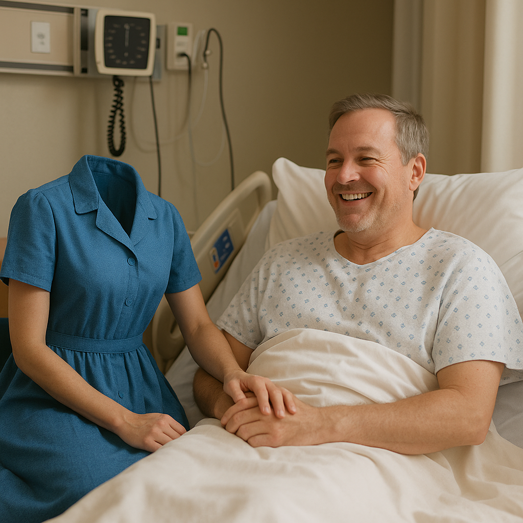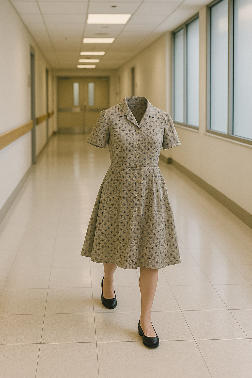 Seeing my own dress among these faceless clinical figures made its role startlingly clear. My clothing interrupts the hierarchy. It softens the environment. It signals that I am not a threat — that I am something familiar, warm, and human.